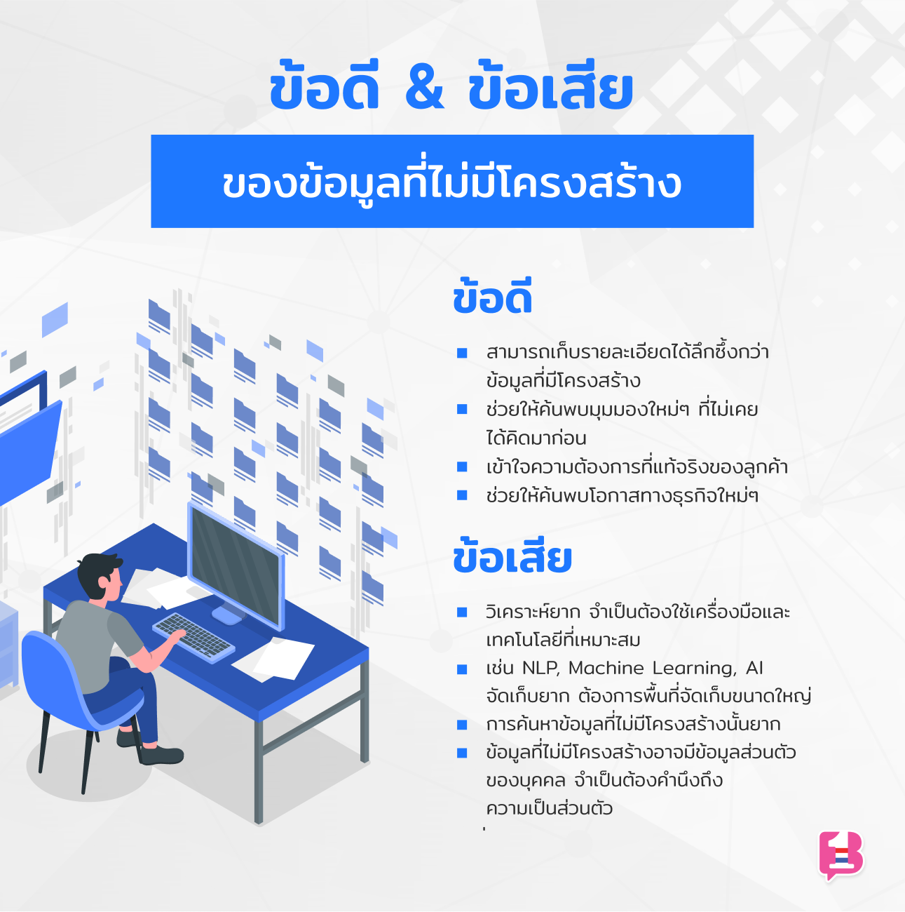 วันนี้เราจะพามาทำความรู้จักกับ Unstructured Data (ข้อมูลที่ไม่มีโครงสร้าง) กัน พร้อมยกตัวอย่างข้อมูล และข้อดี/ข้อเสีย